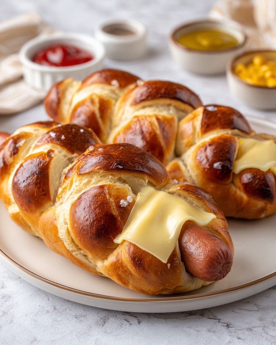 3. Insert the Hot Dogs: Place one hot dog in the middle of each bun, pressing gently to secure the filling and cheese inside the bun.