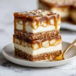 Before serving, generously drizzle caramel sauce over each bar and sprinkle with a pinch of sea salt. The caramel adds depth and sweetness, while the sea salt provides a wonderful contrast that enhances the overall flavor experience of this Apple Pie Cheesecake Bars Recipe.