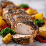 Bagel Chicken with Roasted Veggies is a simple, flavorful sheet pan dinner featuring juicy chicken breasts seasoned with everything bagel seasoning, paired with tender roasted vegetables. It’s a healthy, low-effort meal with big flavor, ready in under an hour—perfect for busy weeknights or meal prep.