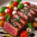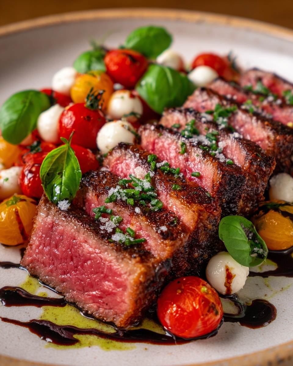 Arrange your beautifully sliced steak on a serving platter, spoon the Caprese topping over it, and drizzle everything with the balsamic glaze. Serve immediately to enjoy the contrast of warm steak with fresh, cool toppings.