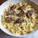 This Beef and Bowtie Alfredo is a hearty and creamy pasta dish featuring tender seared beef strips tossed with bowtie pasta in a rich homemade Alfredo sauce. Ready in just 35 minutes, it combines the comforting flavors of garlic, Parmesan, and Italian seasoning for a satisfying weeknight dinner.