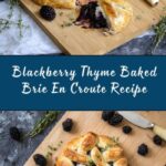 This Blackberry Thyme Baked Brie En Croute is an elegant appetizer featuring creamy brie cheese topped with fresh blackberries, blackberry jam, thyme, and black pepper, all wrapped in flaky puff pastry and baked to golden perfection. It’s perfect for entertaining, offering a delightful combination of sweet, savory, and herbal flavors in a beautifully braided pastry presentation.