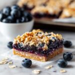 - Assemble Bars: Spread the blueberry mixture evenly over the oat base layer. Then crumble and sprinkle the remaining oat mixture over the blueberries, gently pressing down to form the topping.