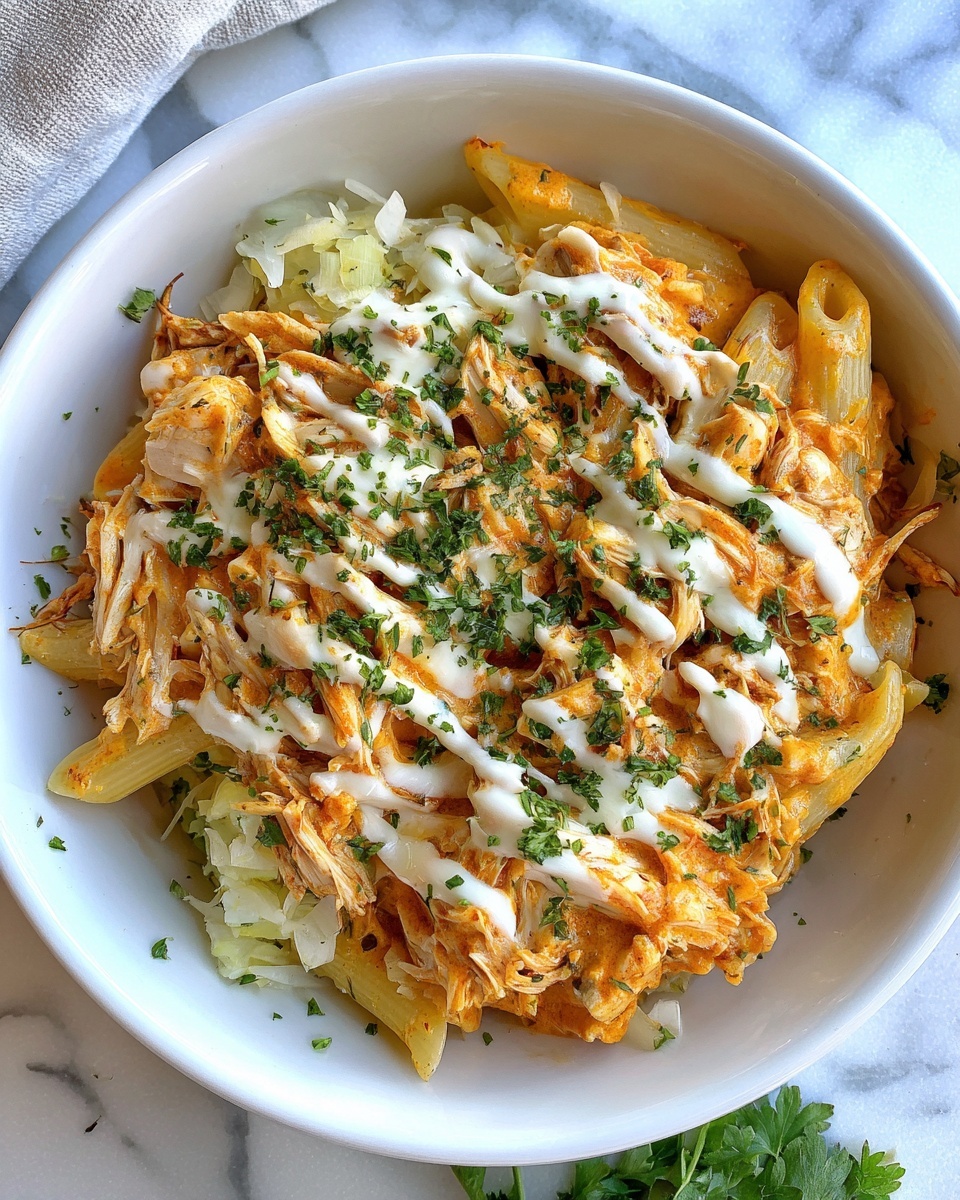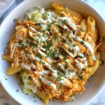 A creamy, spicy Buffalo Chicken Pasta dish that combines tender penne pasta with a rich buffalo wing sauce cream cheese blend, shredded chicken, and melted cheeses for a comforting and flavorful meal. Ready in just 30 minutes, this one-pan recipe is perfect for a quick weeknight dinner with a spicy kick.