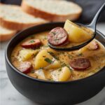 This Cajun Potato Soup recipe is a hearty and flavorful dish featuring browned andouille sausage, tender potatoes, and a well-seasoned broth enhanced with aromatic vegetables and creamy cheddar cheese. Perfect for a comforting meal, it brings a spicy Cajun twist to a classic potato soup, garnished with fresh parsley for added freshness.