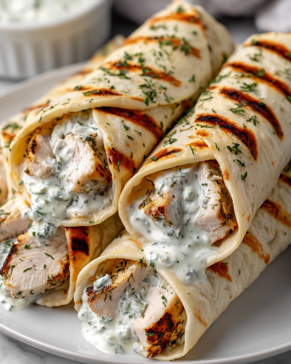 Lay each tortilla flat and begin layering with shredded lettuce, diced tomato, the warm chicken, shredded cheese, and avocado slices if you’re using them. Then generously drizzle your warm garlic cream sauce over the stacked ingredients. This step brings everything home—the sauce ties each element together with its creamy, garlicky goodness. Fold the bottom of the tortilla up over the filling, then fold the sides inwards and roll tightly to encase all those delicious ingredients. Slice each wrap in half and serve immediately for the best experience.