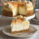 This Coconut Cheesecake offers a creamy, tropical twist on the classic dessert with a rich coconut cream filling and a graham cracker crust, topped with toasted shredded coconut for added texture and flavor.