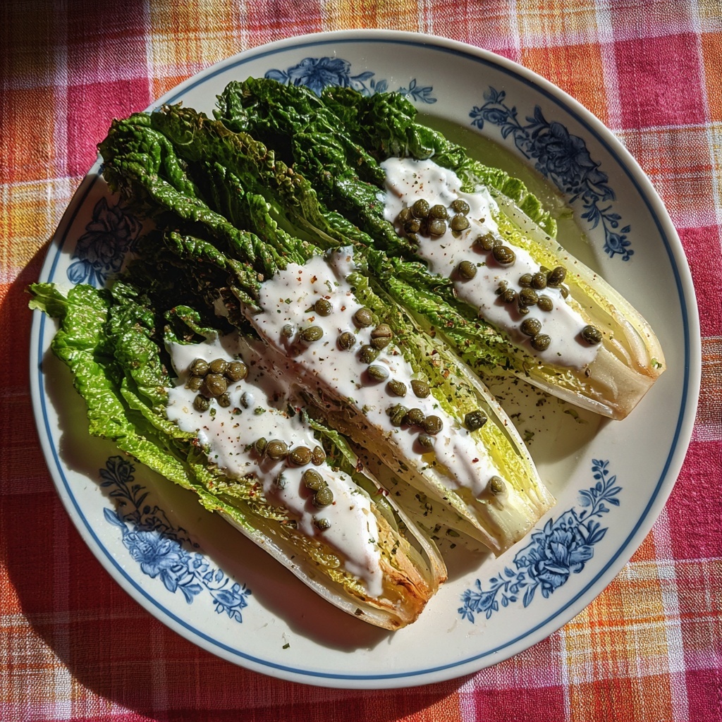 - Prepare the lettuce: Trim the ends of the Cos (Romaine) lettuce heads. Slice each head lengthwise into halves or quarters depending on their size. Rinse the lettuce wedges gently under cold water and pat them dry carefully with paper towels to avoid wilting.