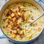 This creamy chicken noodle soup with mini croutons is a comforting, hearty dish perfect for any day. Tender chicken breast cooked in flavorful bacon fat combines with fresh vegetables, tender angel hair pasta, and a rich creamy broth. Crispy homemade croutons and crispy bacon bits add texture and depth, making this soup both satisfying and delicious.