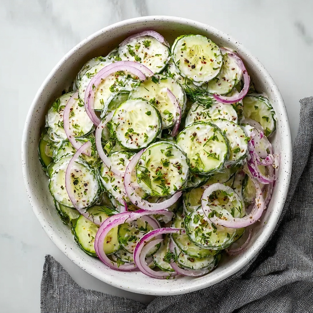 This Creamy Cucumber Salad is a refreshing and tangy side dish made with thinly sliced cucumbers, red onion, and a creamy dressing of sour cream, white vinegar, and fresh dill. It’s chilled to meld the flavors perfectly and is ideal for warm days or as an accompaniment to grilled dishes.