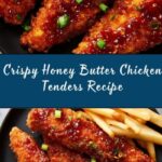 This Crispy Honey Butter Chicken Tenders recipe features tender chicken strips marinated in buttermilk, coated in a seasoned flour mixture, and fried to golden perfection. Finished with a luscious honey butter sauce that adds a delightful sweet and savory flavor, these chicken tenders make a perfect comfort food meal.