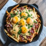 7. Add Poached Eggs and Garnish: Carefully place the poached eggs atop the assembled poutine. Garnish with chopped fresh chives for a bright finish. Serve immediately to enjoy the rich, comforting layers of this decadent breakfast poutine.