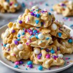 Using a tablespoon or small cookie scoop, drop spoonfuls of the mixture onto parchment or wax paper. Immediately press the reserved M&M’s onto the tops, and if you’re using sprinkles, add those now too. This step gives your candy a festive appearance and an extra layer of sweet crunch.