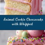 It’s the explosion of playful, colorful crunch from the frosted animal cookies mixed into the filling and the crust, combined with the light pink whipped cream topping and sprinkles that make this cheesecake uniquely festive and full of joyful textures and flavors.