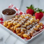 While the funnel cake fries are still warm, dust them generously with powdered sugar. This final touch makes the fries sweet, snowy, and perfectly inviting. Serve immediately for the best experience.