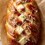 This Garlic Herb Sourdough Bread Stuffed with Brie & Cranberry is a deliciously gooey, flavorful appetizer or snack featuring a crusty sourdough loaf filled with creamy Brie cheese and sweet-tart cranberry sauce. Infused with a fragrant garlic herb butter and baked to golden perfection, it’s perfect for sharing at parties or cozy gatherings.