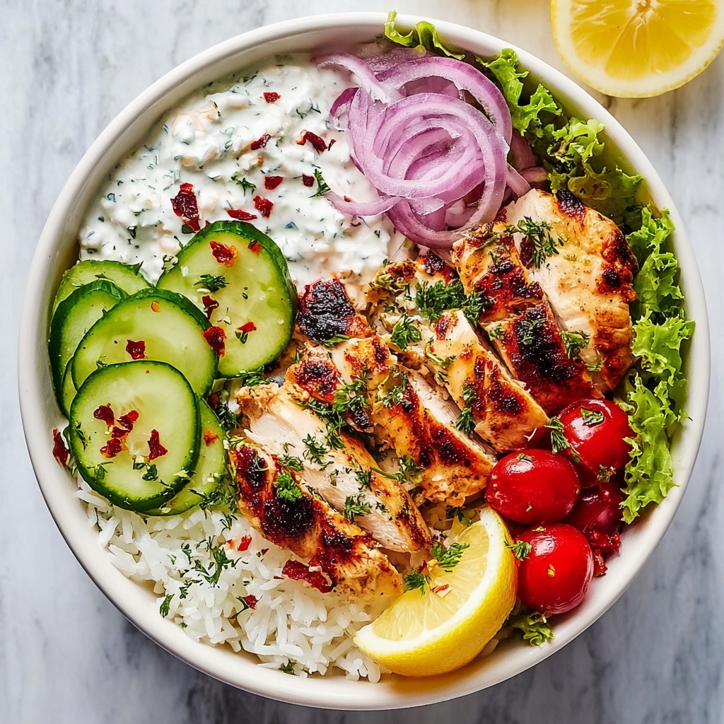 Start with a base of rice or quinoa in each bowl, then artfully arrange the fresh tomatoes, cucumber, lettuce, red onion, and feta on top. Layer the juicy, sliced chicken next, and finish by spooning a generous amount of your creamy tzatziki over everything. For a final pop of brightness, drizzle a little olive oil and lemon juice before serving. Get ready to enjoy every mouthwatering bite!