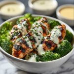 - Assemble Bowls: Slice the grilled chicken breasts into strips. Arrange the steamed broccoli in bowls, place the sliced chicken on top, and generously drizzle with the creamy garlic sauce.
