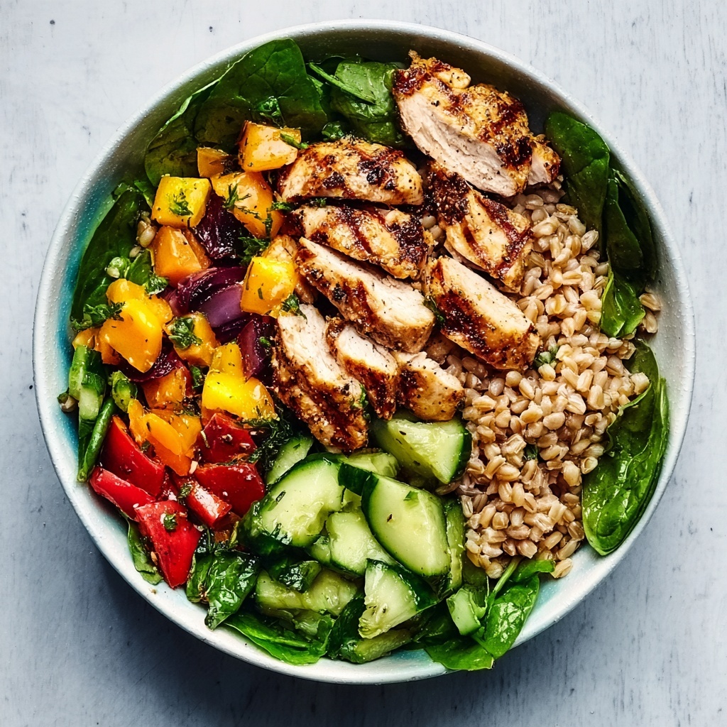 If you’re in the mood for extra greens, a crisp side salad with a lemon vinaigrette pairs wonderfully. Alternatively, serving this bowl alongside warm crusty bread or pita completes the meal, giving you textures and flavors that complement the smoky grilled chicken and roasted veggies.
