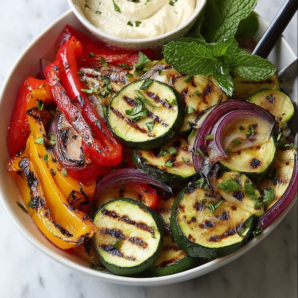 A vibrant and healthy grilled vegetable platter featuring a variety of seasonal vegetables charred to perfection and served with a flavorful cumin-spiced Greek yogurt sauce. This dish is quick to prepare and perfect as a light main course or a colorful side.