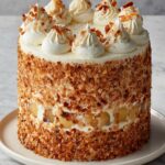 5. Assemble the Cake: After the cake has cooled thoroughly, spread the whipped cream cheese frosting evenly over the top of the cake with a spatula. Optionally, garnish with toasted coconut flakes, extra walnuts, or pineapple slices to enhance the presentation and add extra flavor.
