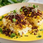 This Herb-Crusted Sea Bass recipe features tender sea bass fillets topped with a flavorful herb and breadcrumb crust, baked to perfection. Served with a vibrant tomato dressing and garnished with toasted coconut, this dish combines fresh herbs, zesty lemon, and a touch of sweetness for a sophisticated and delicious meal perfect for any occasion.