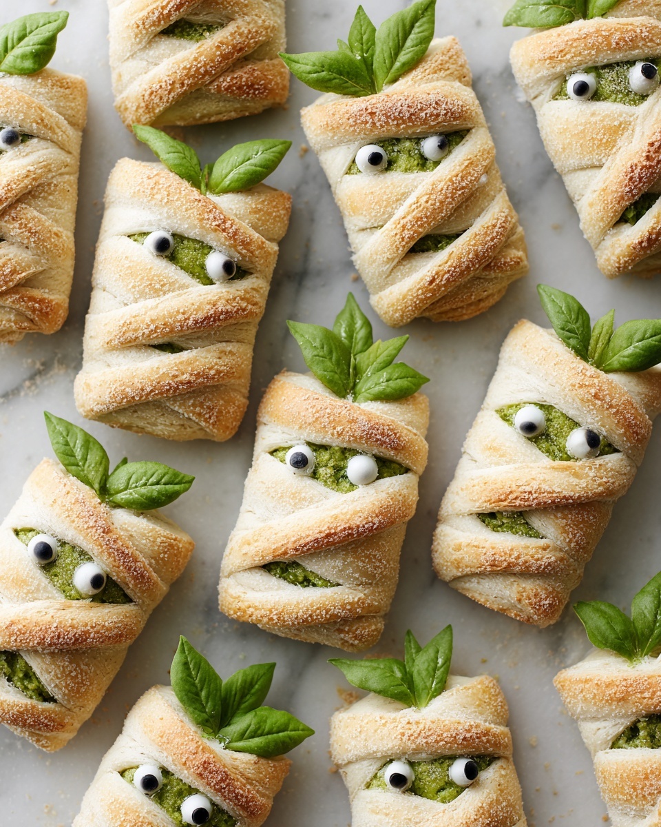 These mummies pair wonderfully with light, crunchy sides like veggie sticks or a crisp green salad to cut through their richness. For heartier parties, serving alongside mac and cheese or loaded nachos keeps the festive spirit alive with complementary textures and flavors.