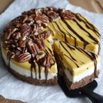 - Assemble the Cheesecake: Once the cheesecake has chilled, drizzle the caramel sauce over the top, then add the chocolate sauce in a decorative swirl pattern. Sprinkle the toasted pecans over the cheesecake.