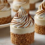 6. Top and toast meringue: Pipe or spoon the meringue over the lemon curd layer on each cheesecake. Toast the meringue with a kitchen torch or place under the broiler briefly, watching closely to achieve a golden-brown finish without burning.
