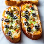 This Olive Cheese Bread recipe combines the rich flavors of Monterey Jack cheese, pimento-stuffed and black olives, and green onions spread over crusty French bread, baked to golden bubbly perfection. Perfect as an appetizer or party snack, it’s a savory treat with a crispy, cheesy top and soft, flavorful base.