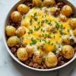 This One-Pan Cheesy Meat & Potato Skillet is a hearty and comforting dish perfect for a quick weeknight dinner. Ground beef is browned with sautéed onions and garlic, then simmered with tender baby potatoes until cooked through. Topped with melted cheddar cheese and fresh green onions, this easy skillet meal combines savory flavors and satisfying textures all in one pan.