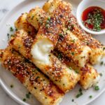 Crispy oven-fried feta rolls filled with a savory blend of feta cheese, fresh dill, and garlic, baked to golden perfection and served with a spicy, sweet chili honey dipping sauce. This delightful appetizer offers a perfect balance of creamy, crunchy, and flavorful elements, ideal for entertaining or a delicious snack.