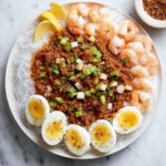 Place the cooked rice noodles on a large serving platter or individual plates, then ladle the thick, savory shrimp sauce generously on top. The final flourish involves layering your toppings: tender cooked shrimp, sliced hard-boiled eggs, crushed chicharrón for that crunchy pop, a sprinkle of green onions, and those addictive fried garlic bits that add endless aroma and texture.