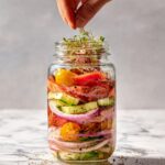 1. Prepare the vegetables: Slice the cherry tomatoes in half, slice the cucumber into thin rounds, and thinly slice the red onion. Place all the vegetables in a clean glass jar or container with a tight-fitting lid.