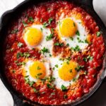 You can omit the eggs and add chickpeas or tofu for protein instead. However, the baked eggs are central to traditional shakshuka’s charm, so the texture and flavor will be different.