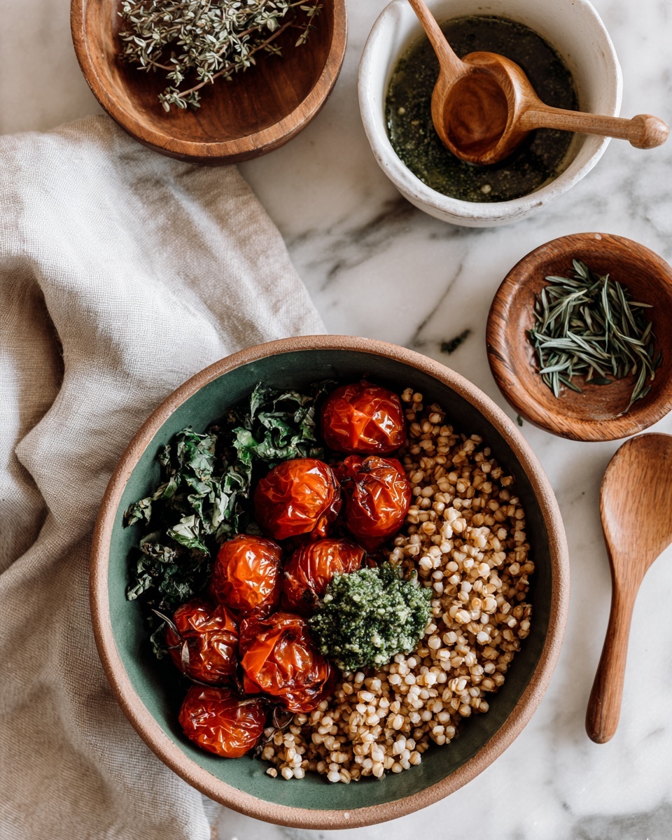 Start by preheating your oven to 400°F (200°C). Toss your cherry tomatoes in olive oil, sprinkle on the fresh thyme leaves, and season with salt and pepper. Spread them out on a baking sheet and roast until they’re blistered and tender, about 20 to 25 minutes. This step intensifies their natural sweetness and creates a luscious burst of sunshine in every bite.