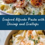 Seafood Lovers’ Dream Alfredo is a rich and creamy pasta dish combining succulent shrimp, tender sea scallops, and sweet lump crab meat in a luscious Alfredo sauce. Perfectly cooked fettuccine is tossed in a decadent sauce made from heavy cream, butter, olive oil, and freshly grated Parmesan cheese, seasoned with garlic, black pepper, and a hint of crushed red pepper flakes. This Italian-American seafood pasta offers a luxurious and satisfying main course for seafood enthusiasts.