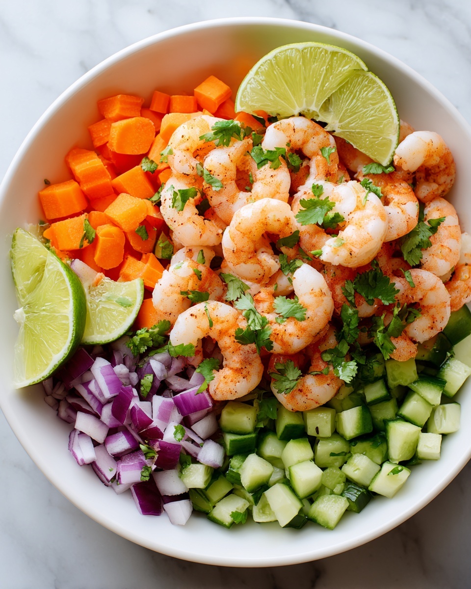 • 1 cup fresh lime juice (about 8–10 limes): Essential for “cooking” the shrimp and adding zesty acidity.