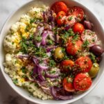 This vibrant Sicilian Cauliflower Salad combines tender-crisp cauliflower florets with a zesty dressing of olive oil, red wine vinegar, and lemon juice, accented by tangy green olives, capers, sun-dried tomatoes, toasted pine nuts, and fresh parsley. Served chilled or at room temperature, it’s a flavorful, healthy vegan and gluten-free side dish perfect for Mediterranean-inspired meals.