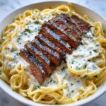 A rich and flavorful Steak Gorgonzola Alfredo featuring tender sirloin or ribeye steak slices atop creamy Parmesan and Gorgonzola cheese sauce tossed with fettuccine or penne pasta. This Italian-American main course combines the boldness of blue cheese with the smoothness of a buttery Alfredo sauce, enhanced by optional baby spinach and sun-dried tomatoes for added depth.