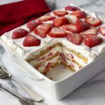 This Strawberry Icebox Cake is a refreshing no-bake dessert perfect for warm weather. Layers of crisp graham crackers, fluffy whipped cream, and fresh strawberries combine to create a light and creamy treat that requires minimal effort and time. Chilled to perfection, it’s an easy and elegant dessert to impress family and friends.