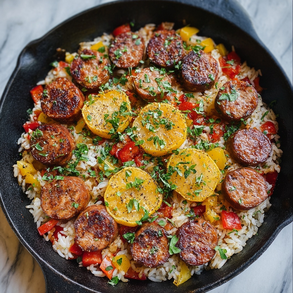 This Summer Sausage Skillet with Andouille Sausage is a vibrant, flavorful one-pan meal combining smoky sausage, fresh vegetables, and sweet grilled corn, all brought together with a creamy basil cilantro crema. Perfect for a quick and satisfying dinner, it offers a balance of savory, smoky, and fresh herbaceous flavors with a touch of creaminess.