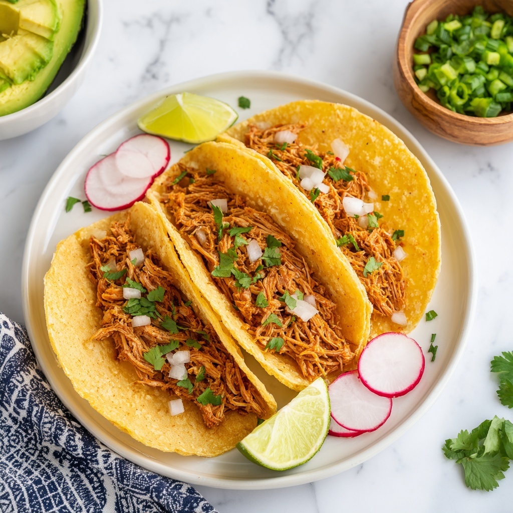 Chicken Tinga Tacos feature tender shredded chicken simmered in a smoky, spicy chipotle tomato sauce, served on warm corn or flour tortillas and topped with fresh ingredients like avocado, cotija cheese, cilantro, lime, and radishes. This flavorful Mexican dish is perfect for a quick and satisfying meal.