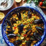 8. Serve and Garnish: Garnish the paella with fresh chopped parsley and lemon wedges. Optionally, for a classic socarrat crust, increase the heat during the last 2 minutes of cooking without stirring to achieve a crispy bottom layer. Serve immediately and enjoy.